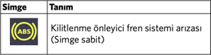 ABS uyarı lambası, kilitlenme önleyici fren sisteminin devre dışı kaldığını veya sistemde bir arıza algılandığını gösterebilir. Araç çoğu durumda hareket etmeye devam edebilir; ancak özellikle ani frenleme anlarında tekerleklerin kilitlenme riski artabileceği için daha dikkatli kullanılmalı ve sistem en kısa sürede kontrol ettirilmelidir.