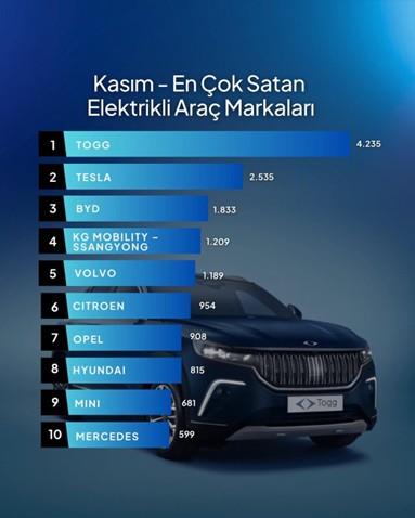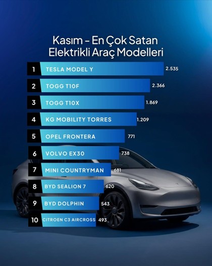 Türkiye’de elektrikli araç sahipliği istikrarlı biçimde artmaya devam etmektedir. Kasım ayında 17.892 Elektrikli araç satışı gerçekleşmiştir ve Kasım 2025 itibarıyla elektrikli araç parkı 341 bin adedi aşmış ve pazar payı %17,5 seviyesinde devam etmiştir. Verilere göre Togg, hem Kasım ayında hem de Ocak-Kasım döneminde en çok satış yapan marka olarak liderlik koltuğuna oturdu. Ancak model bazlı satışlara bakıldığında zirvenin sahibi değişti. Elektrikli modeller arasında en çok tercih edilen araç, Tesla Model Y oldu.